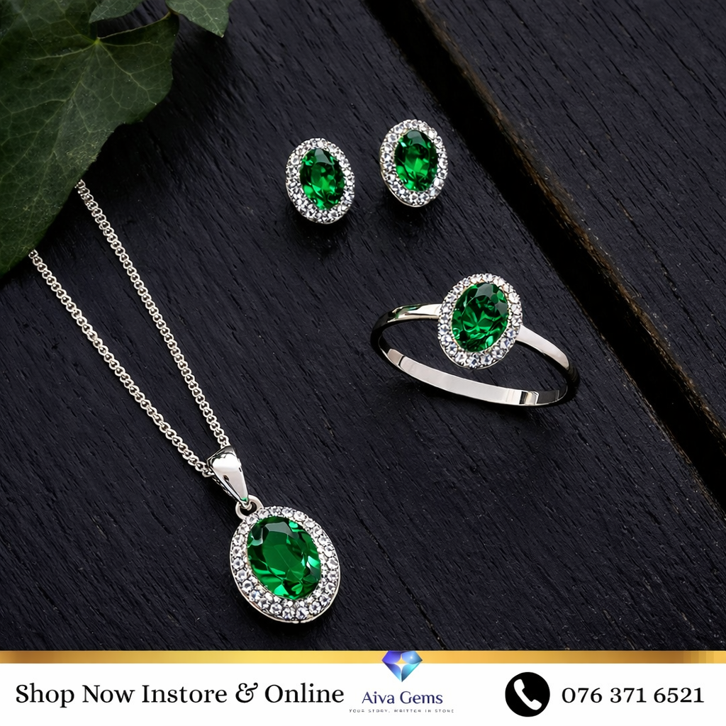 This elegant Green Zircon jewelry set is a beautiful combination of sophistication, freshness, and timeless charm. The set includes a stunning pendant with chain, a matching ring, and a graceful pair of earrings, all designed to create a refined and luxurious look. Each piece features a vibrant green zircon gemstone that stands out brilliantly against the polished silver-tone setting and sparkling surrounding stones. The pendant with chain adds a delicate and graceful touch, while the ring and earrings complete the look with matching elegance. Perfect for special occasions, gifting, or personal wear, this jewelry set is ideal for anyone who loves classy gemstone jewelry with a rich and eye-catching appearance.